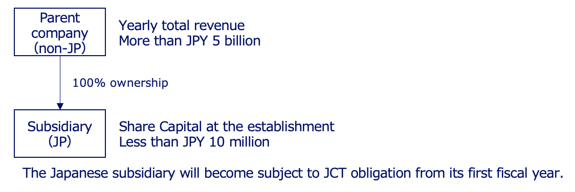 Accordingly, under the 2024 amendment, when a non-Japanese company with continuous large-scale revenue (more than JPY 5 billion in a fiscal year) establishes a Japanese subsidiary, the subsidiary becomes subject to JCT obligation from the time of its establishment, regardless of the amount of its Share Capital.